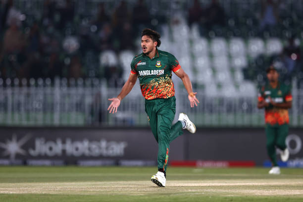 RAWALPINDI, PAKISTAN – FEBRUARY 24: Taskin Ahmed of Bangladesh celebrates the wicket of Will Young of New Zealand ( during the ICC Champions Trophy 2025 match between Bangladesh and New Zealand at Rawalpindi Cricket Stadium on February 24, 2025 in Rawalpindi, Pakistan. (Photo by Chris Hyde-ICC/ICC via Getty Images)