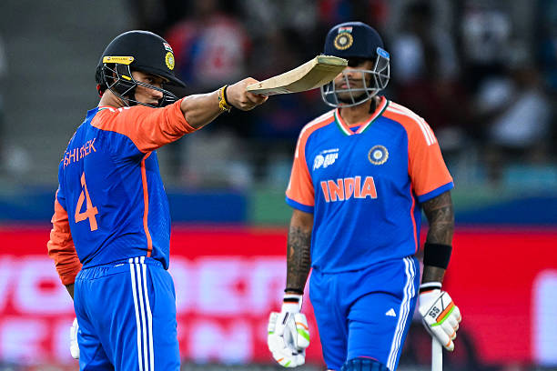 India’s Abhishek Sharma (L) celebrates after scoring half-century (50-run) as team captain Suryakumar Yadav looks on during the Asia Cup 2025 Super Four Twenty20 international cricket match between India and Sri Lanka at the Dubai International Stadium in Dubai on September 26, 2025. (Photo by Sajjad HUSSAIN / AFP) (Photo by SAJJAD HUSSAIN/AFP via Getty Images)