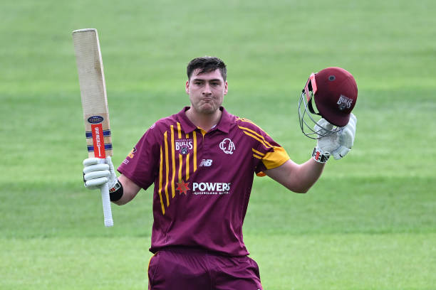 HOBART, AUSTRALIA – DECEMBER 03: Matthew Renshaw of the Bulls raises the bat to celebrate scoring a century during the ODC match between Tasmanian Tigers and Queensland Bulls at Blundstone Arena, on December 03, 2024, in Hobart, Australia. (Photo by Steve Bell/Getty Images)