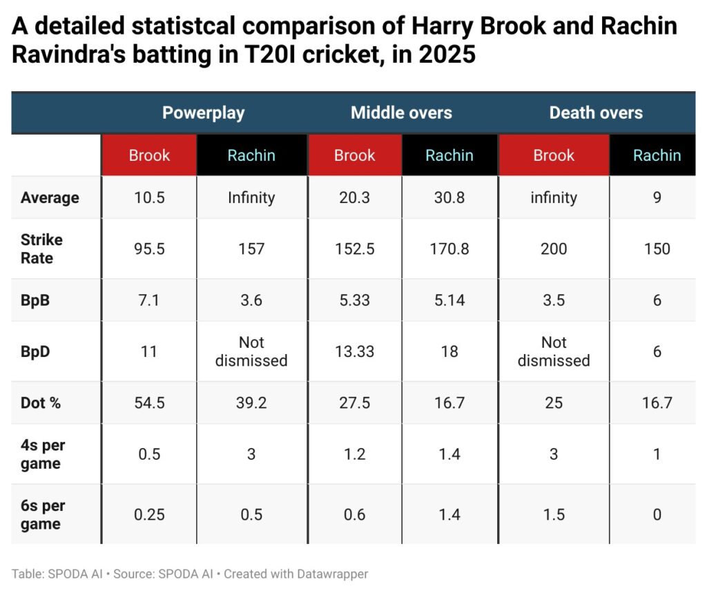 Rachin’s current powerplay numbers suggest major advancement. His strike rate during this phase climbs to 157, much higher than Brook’s 95.5. Remarkably, Rachin has not been dismissed in the powerplay in these games, resulting in an infinite average for now. He registers a boundary every 3.6 balls compared to Brook’s 7.1, with a lower dot ball percentage at 39.2 percent. Rachin averages 3 fours and 0.5 sixes per match in the powerplay, showing clear dominance.